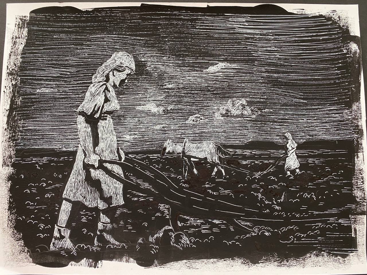 Марина Деревягина специально к празднику создала серию графики о блокадных испытаниях холодом и голодом, а также предоставила на выставку серию эскизов для большого живописного проекта "Цветы Победы", который будет показан в НГХМ в мае.