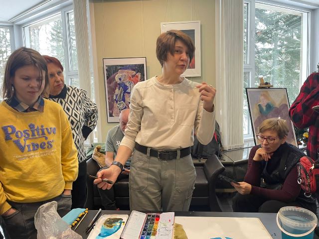 Члены клуба занимаются рисованием в разных техниках.