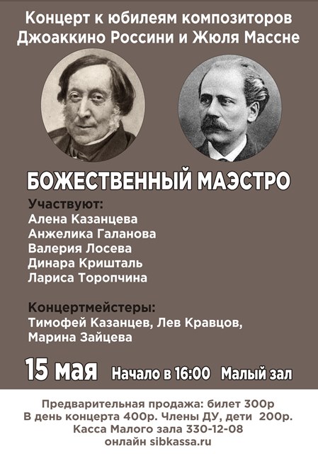 15 мая в Малом зале Дома ученых в 16.00 состоится музыкальная программа «Божественный маэстро» в честь 230-летия со дня рождения Джоаккино Антонио Россинии и 110 –летия со дня рождения Жюля Массне