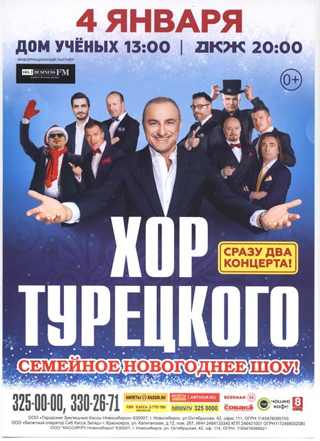 Новогодний концерт Хора Турецкого – это любимые хиты, яркие образы артистов и шоу уникальных голосов! Вас ждет искусство высоких вибраций и коктейль музыкальных витаминов.