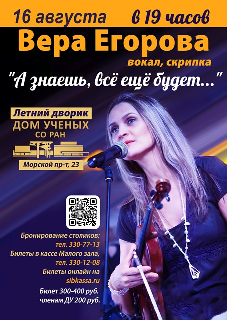 Вера Егорова, вокал, скрипка в программе "А знаешь, все еще будет..."Предварительная продажа: Билет 300р. В день концерта 400р. онлайн sibkassa.ru