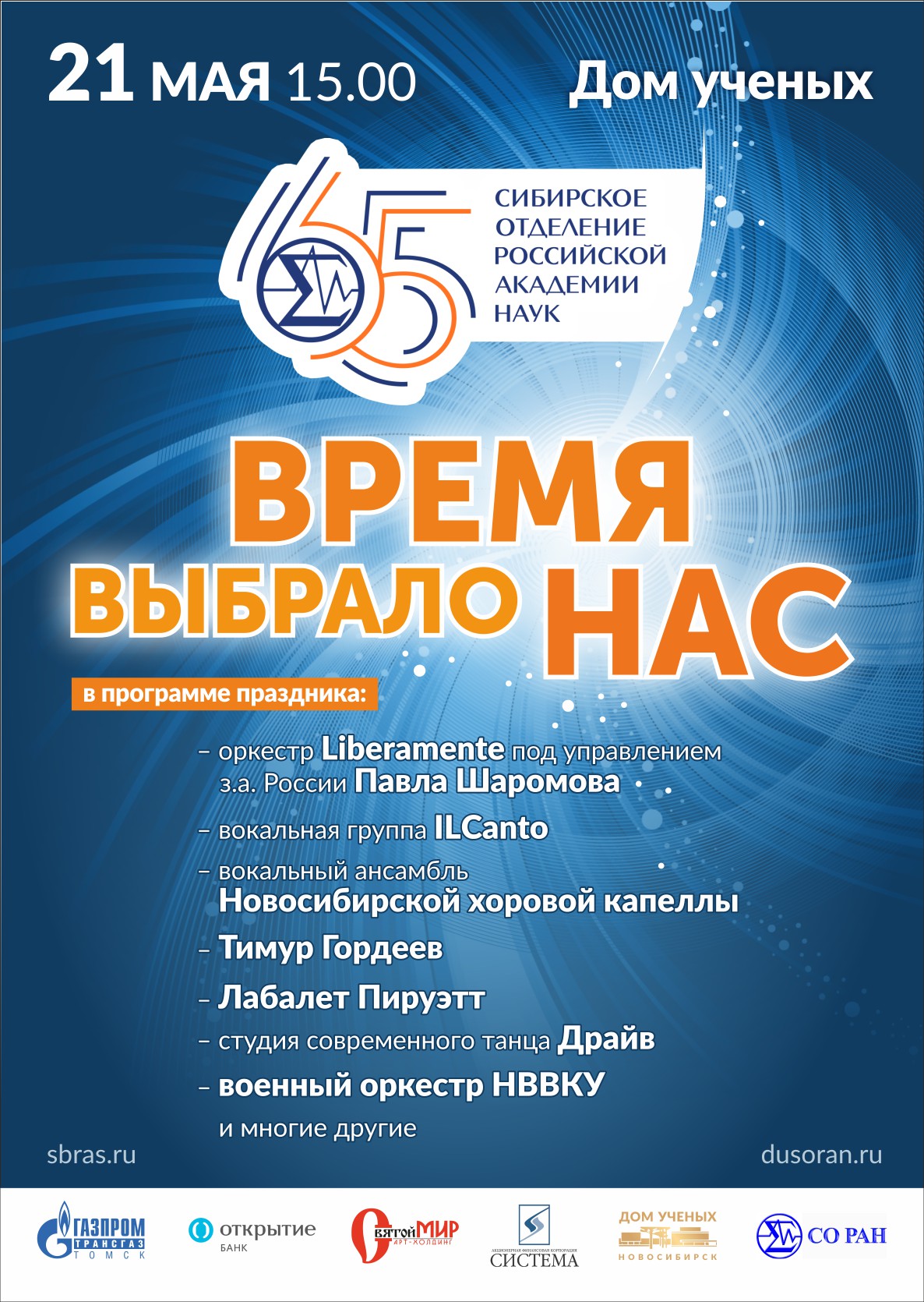 Дом ученых принимает активное участие в проведении праздничных мероприятий, а дни рождения и юбилеи принято отмечать с друзьями. Приглашаем вас на праздничную программу «Время выбрало нас», которая состоится в Большом зале Дома ученых 21 мая 2022 г. в 15 ч. В мероприятии примут участие ведущие творческие коллективы Новосибирска; с поздравительным словом выступят председатель СО РАН академик Пармон В. Н., официальные лица города и области.