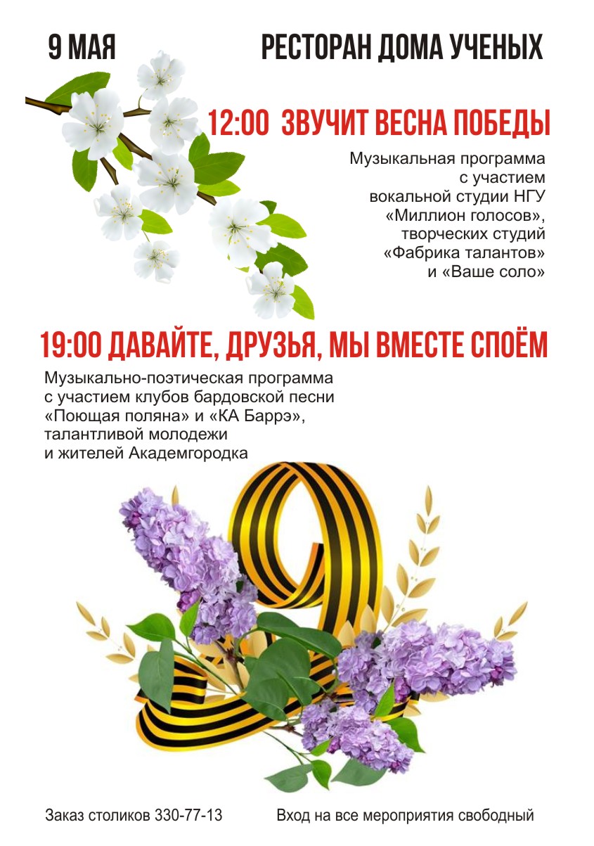 12:00 «Звучит весна Победы» (музыкальная программа с участием вокальной студии НГУ «Миллион голосов», творческих студий «Фабрика талантов» и «Ваше соло», вокальной студии «Ступеньки к звездам» и театральной студии «Импровизация» ЦДТ Советского района)