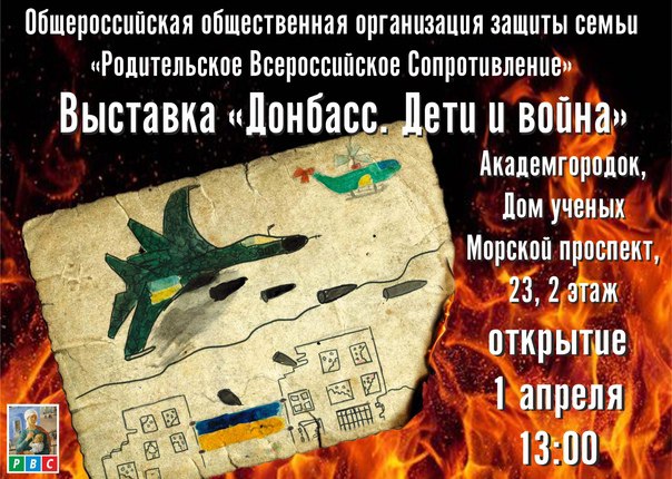 Родительское Всероссийское Сопротивление (РВС) представляет выставку детских рисунков. На выставке представлены рисунки детей Донбасса, бежавших вместе с родителями от ужасов военных действий властей Украины в 2014 году в Россию. Рисунки отражают детские впечатления о пережитых бомбардировках и обстрелах.