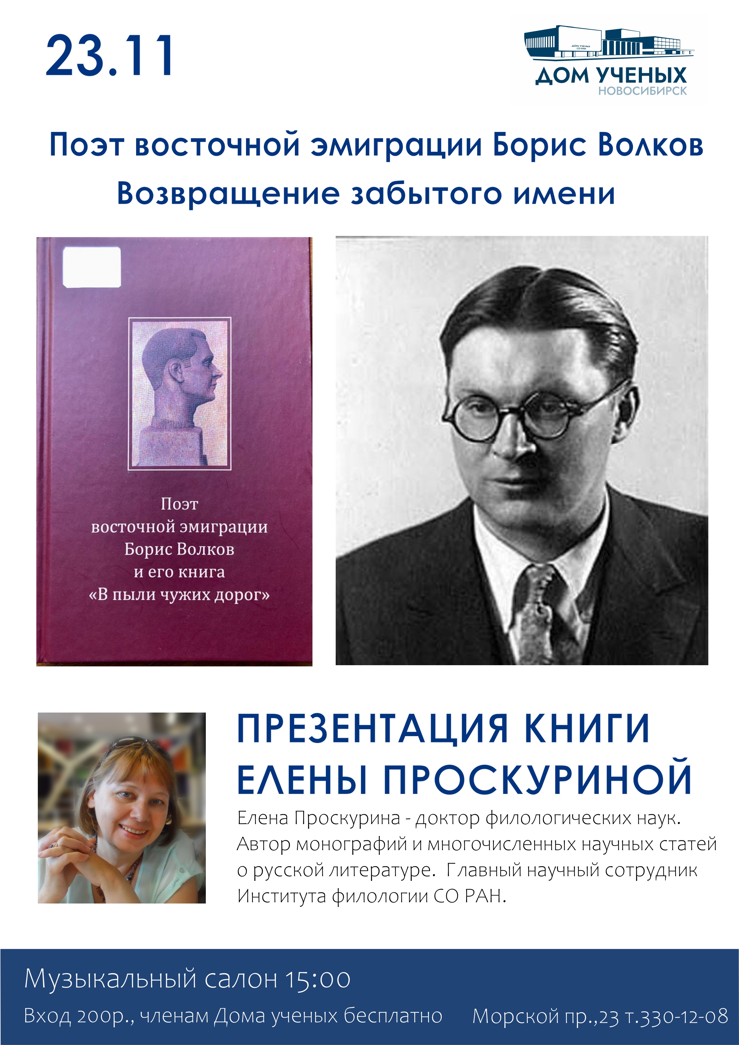 Елена Николаевна представит зрителям свою книгу "Поэт восточной эмиграции Борис Волков и его книга "В пыли чужих дорог".
