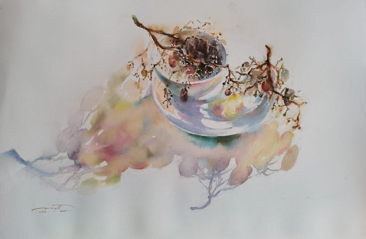 Дача - это лето, это цветы, ягоды, это дождик и речка, это прогулки по лесным тропинкам, это радость и счастье, которыми и оказались наполнены работы Максима Демчука до предела! Это солнечное время органично совпало ещё и с творческим почерком художника - легкая недосказанность его повествования вкупе с прозрачностью техники акварельной живописи, предполагающей много белого листа рождает очень легкие и воздушные работы: светящиеся сочные яблоки, солнечная кожура только что выкопанной картошки, налитые соком малина, лепестки цветов...