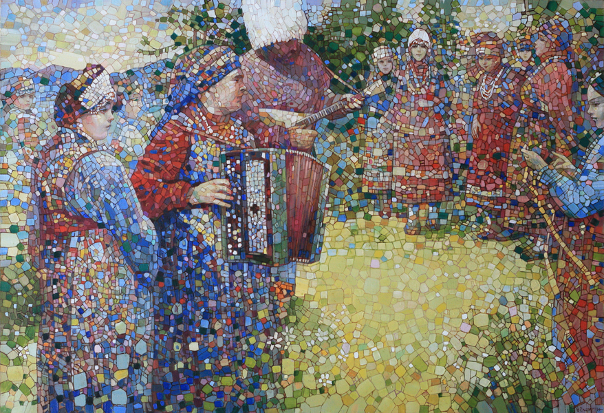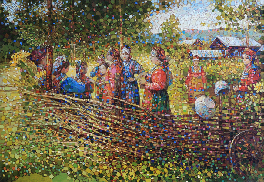 В картинах Владимира Распутина мы видим "семейских" в ярких традиционных нарядах на праздниках, в своих старинных домах, уютных ухоженных дворах. "Семейские" бережно хранят не только бытовые вещи, одежду, но и свои песни, обычаи, ремесла, прививают детям семейные ценности, любовь к труду, к своей Родине.