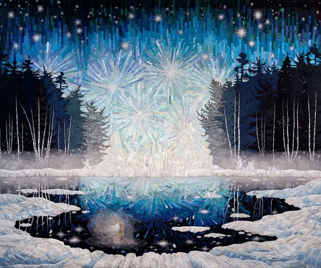 «Меня всегда завораживало сияние, исходящее от платьев на моделях, идущих по подиуму во время показов моды. На каждое движение тела ткань отвечает своим контр-движением. Каждое мгновение возникают всполохи и блики. Идет непрерывная игра света на изломах и складках. Все время разное состояние, невозможно получить два одинаковых изображения. Постоянная изменчивость света и цвета. На куске шелковой или синтетической ткани оттенки меняются в зависимости от того, как она ляжет, как сомнется, и как на нее ляжет свет. Мне хотелось использовать эту магию шелка в своей работе. Но ткань, которая необыкновенно красиво проявляла себя в одежде, в объемном изделии, в плоскости пэчворка становилась застывшей. Плоско положенная, она теряет свои декоративные свойства, которые в неё изначально заложили художники, технологи и мастера текстильной индустрии. Нужно было все время отходить, перемещаться в разные стороны, что бы хоть как-то раскрылся ее декоративный потенциал. Я начала искать способ, как обогатить пэчворк не только цветом, но и светом. Одна и та же ткань, положенная под разным углом, давала различные цвета, в зависимости от того, как на нее ложился свет. Потом мы начали исследовать, как с помощью фона из светоотражающих тканей передать ощущение покоя, волнения, торжественности, тайны, сияния и т. д."