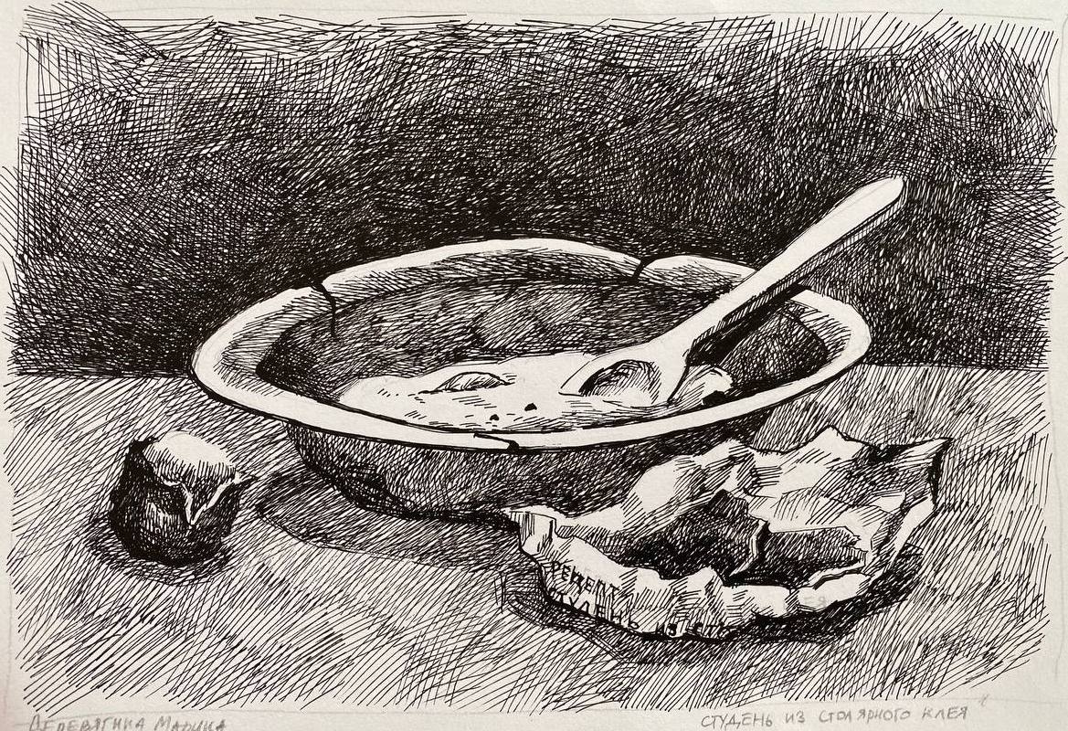 Марина Деревягина специально к празднику создала серию графики о блокадных испытаниях холодом и голодом, а также предоставила на выставку серию эскизов для большого живописного проекта "Цветы Победы", который будет показан в НГХМ в мае.