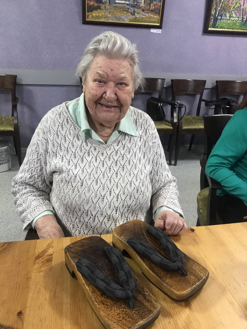 Нелли Яковлевна Гордиенко, старейший член Дома ученых, которая принимает участие в работе клубов "Сакура" и "Наш дом" воспользовалась случаем, чтобы преподнести любителям восточной экзотики настоящие деревянные японские сабо - гэта. Пара тут же была помещена в витрины выставочного зала для всеобщего просмотра.