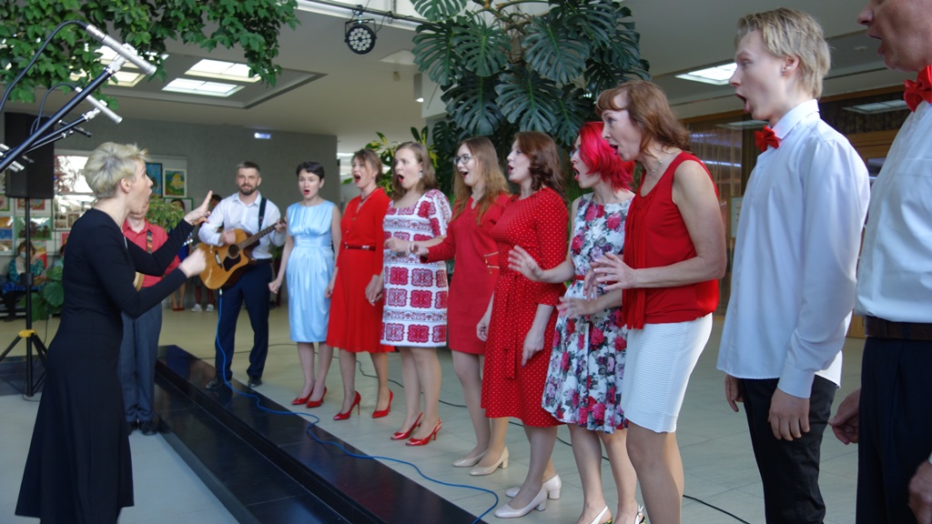 В 18.00 в программе «Расцветали яблони и груши», которая состоялась в Зимнем саду, приняли участие ансамбли «Mamus Academus» и «Ровнов7» и другие коллективы.