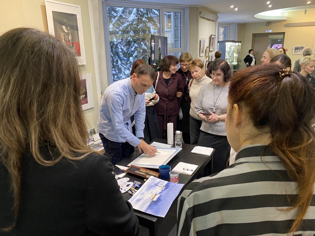 Павел Новырев проводит демонстрацию работы новейшими акварельными материалами