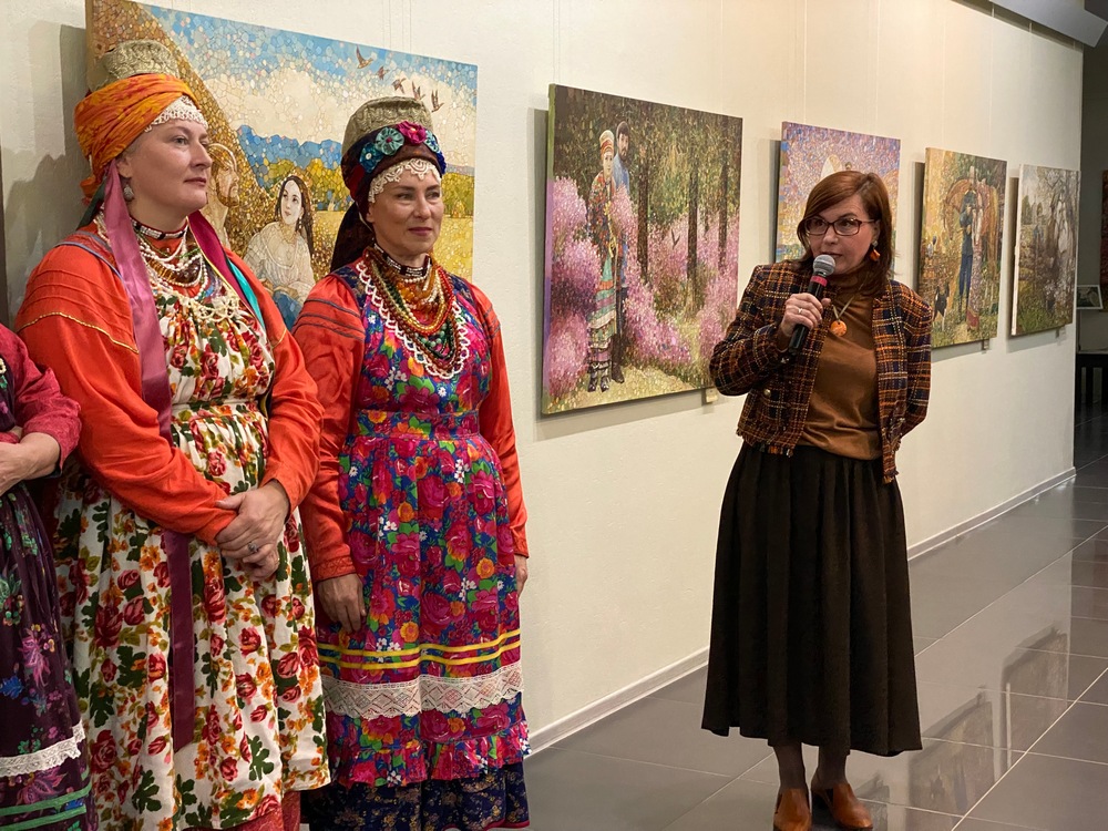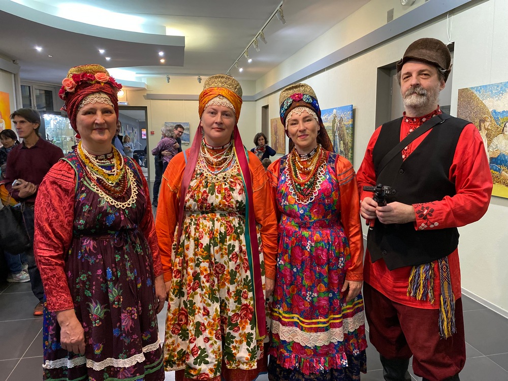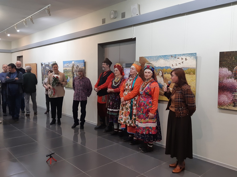 И здесь же в зале можно было увидеть гостей в настоящих этнографических костюмах семейских староверов. Это выступает фольклорный коллектив "Полынь", часть центра "КрАсота" Оксаны Ильиничны Выхристюк. Поэтому народные песни в выставочном зале звучали весь вечер вернисажа, вовлекая все новых и новых зрителей, слушателей, в свои очень мелодичные напевы, неспешные хороводы.