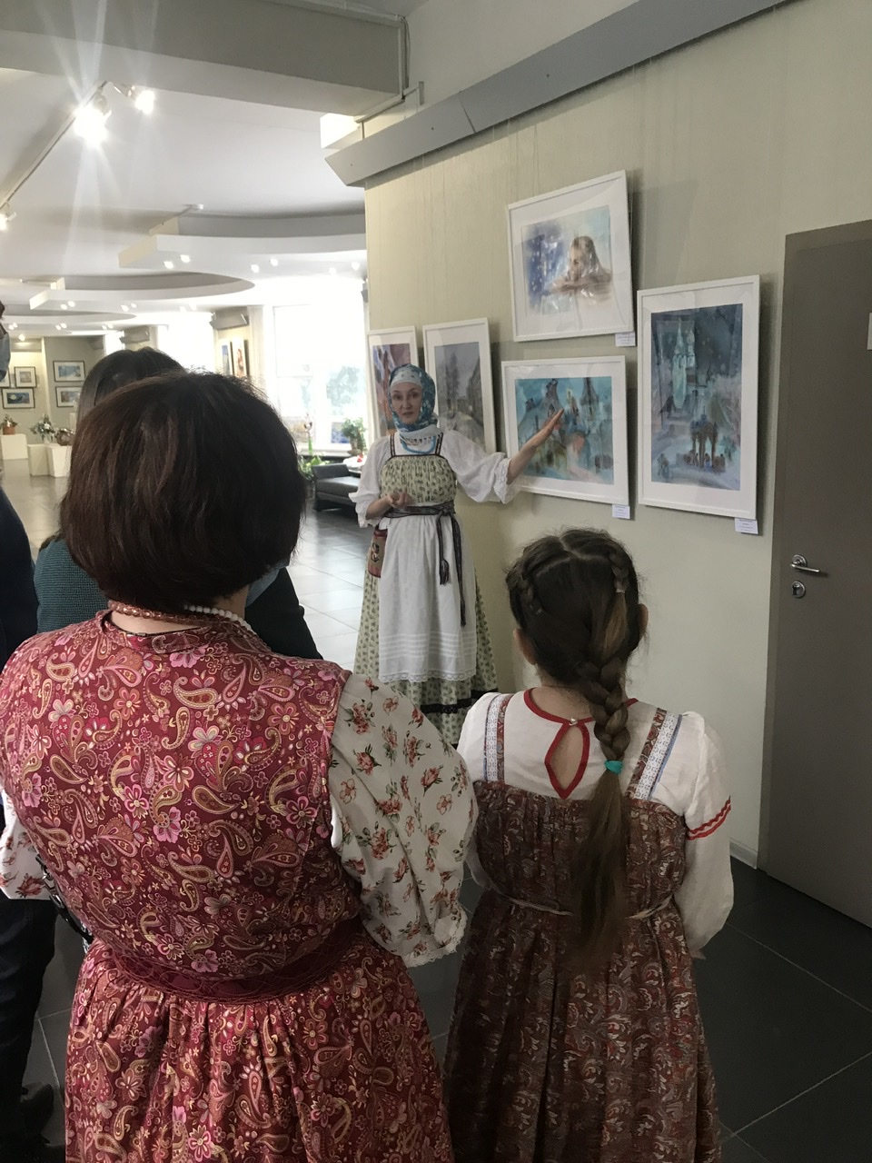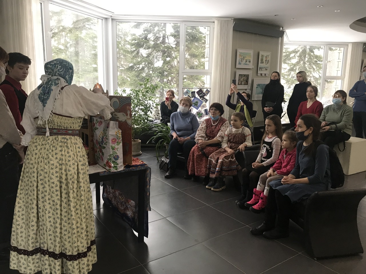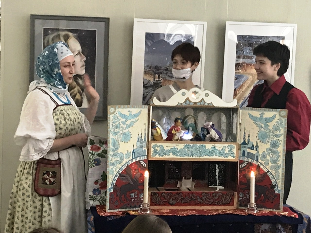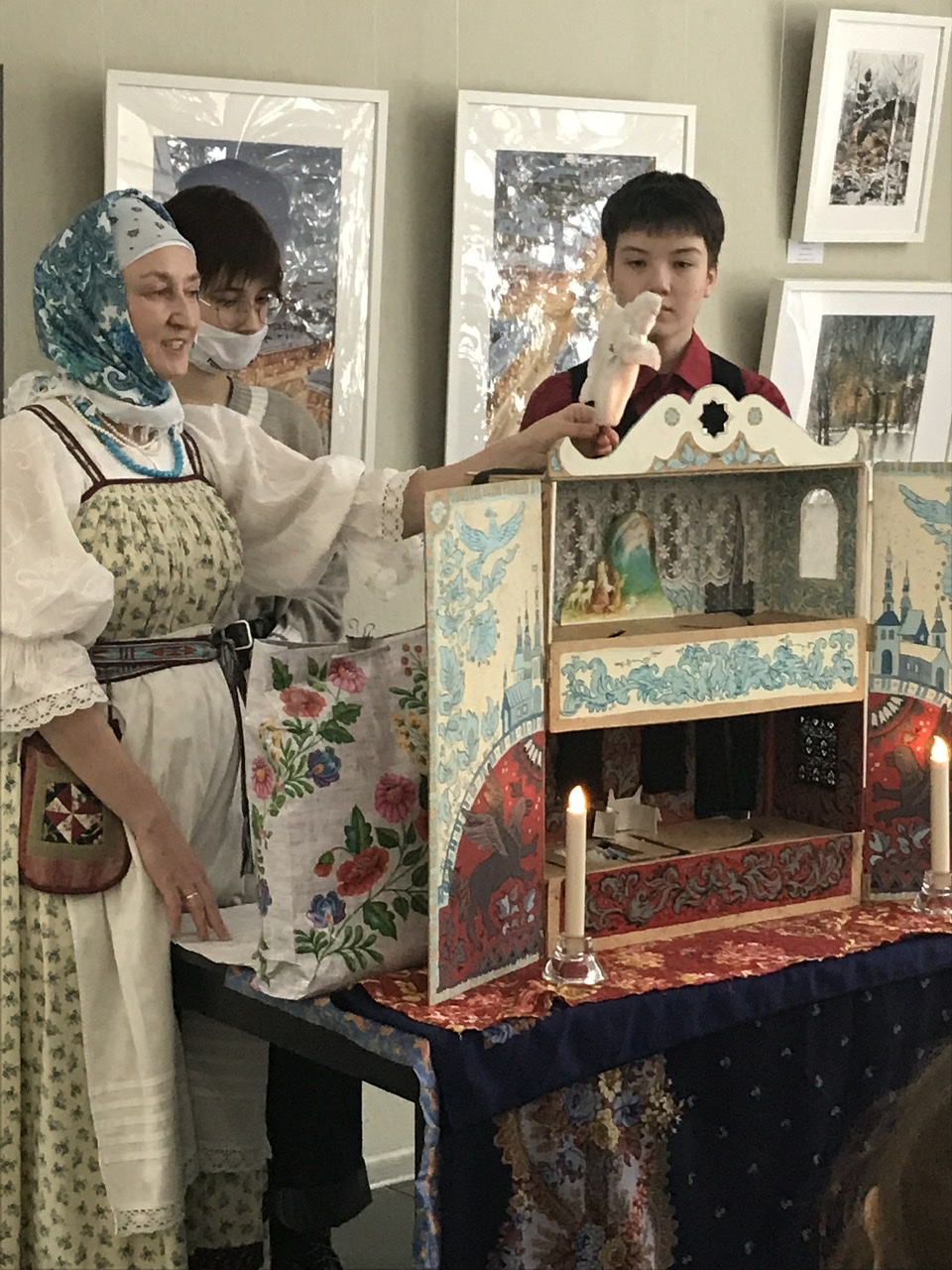 В тот же день было организовано святочное представление от участника выставки из Кольцово Оксаны Чернышевой «Рождественский вертеп. Традиция народного театра в современном исполнении». Оксана и двое её юных помощников рассказывали историю праздника, пели, исполняли святочные колядки. Затем Оксана Витальевна, педагог и художник, рассказала о своих акварелях, представленных на выставке фестиваля, о монастырях Суздаля и на тему Рождества.