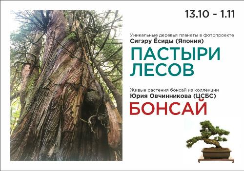 Проект "Пастыри лесов" объединил фотографии известного японского фотографа Сигеру Есиды и миниатюрные растения в стиле бонсай Юрия Викторовича Овчинникова (ЦСБС). Фотографии представляют величайшие деревья со всего мира: баобабы, секвойи, криптомерии, оливы... Растения бонсай представляют в экспозиции разнообразные виды фикуса и шефлер. В умелых руках мастера они становятся подобием подлинного природного чуда в миниатюре. Густая крона, узловатые ветви, переплетения воздушных корней, осколки камней, мхи и травы создают впечатление настоящего величественного исполина, созданного содружеством природных стихий, а не отнюдь руками человека. Растениям на фотографиях - от 300 до 2000 лет, их собратья в глиняных плошках - от 10 до 30 и более лет, но они так похожи по пластике, графике ветвей, крон, что зрители как завороженные не могут оторваться от этой красоты.