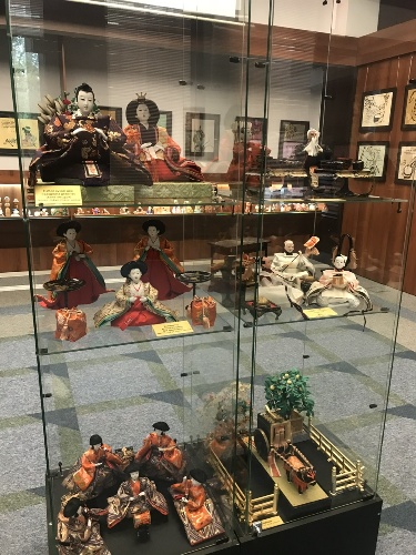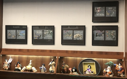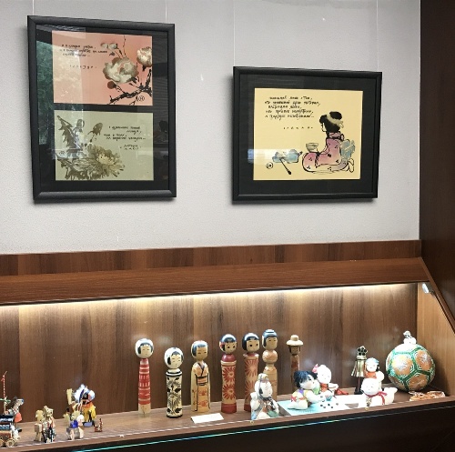 В Арт-гостиной разместилась очень лиричная и познавательная выставка японских кукол и графики на стихи японских поэтов известного художника Елены Волковой. Куклы в национальных нарядах и традиционные игрушки рассказывают о традициях страны восходящего солнца и на своей родине служат не только украшением дома, но и для воспитания детей: привития им этических и эстетических знаний и канонов. Так, например, представленные на выставке наборы для праздников мальчиков и девочек рассказывают о ритуалах, традиционных нарядах, придворном этикете, кодексе самурая и тд. Есть игрушки и совсем простые: волчки, пирамидки, погремушки для малышей, игровые куклы итимацу. И интерьерные куклы, которых можно назвать почти скульптурой.