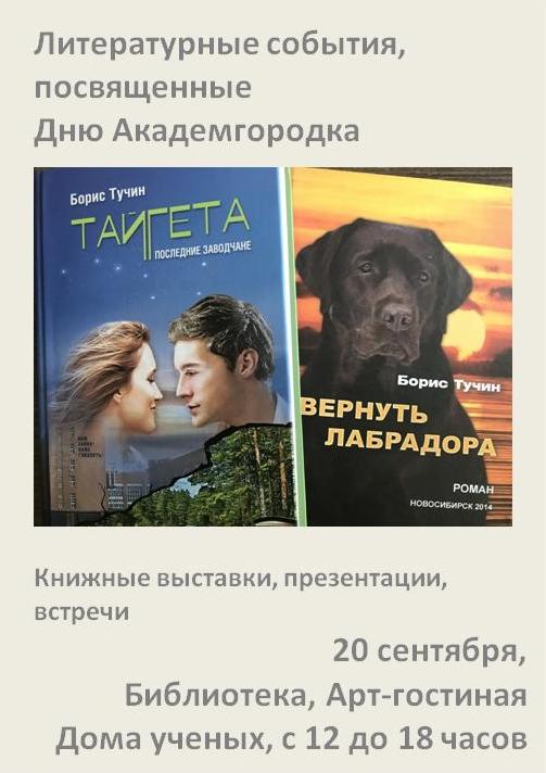 В 14.00 Мы приглашаем всех на презентацию книг члена Союза писателей России Б.И.Тучина: «ТАЙГЕТА» и «ВЕРНУТЬ ЛАБРАДОРА». Истории из нашего недавнего прошлого, о местах, нам всех знакомых и близких. Истории, которые эхом отзовутся в сердцах тех, кто жил и работал в те времена, а молодым людям приоткроют то, что волновало и заботило их родителей.