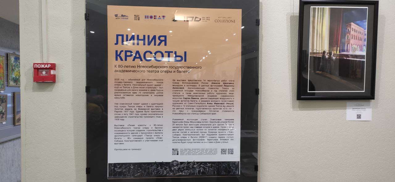 Выставка «Линия красоты: к 80-летию Театра оперы и балета» открылась 22 октября в выставочных залах НДУ. Экспозиция соединила красоту архитектуры в фотографиях и пластику танцовщиц балета в произведениях живописцев Сергея Бакина и Анны Ивановой. Замечательная коллекция предоставлена новосибирской галереей "Частная коллекция", директор - Ирина Юдашкина.Экспозиция фотографий и исторических экспонатов выставки подготовлена коллективом энтузиастов проекта Ново-Сибирск. Конструктивизм!, руководитель - Евгений Дубровин, куратор Карина Ляникова. Главным действом стала премьера фотографической копии монументального панно фасада НОВАТа, которое обычно все гости театра видят по частям. И только благодаря невероятным усилиям команды проекта и его фотографа Алексея Школдина теперь панно "Танцы народов СССР" можно увидеть целиком.