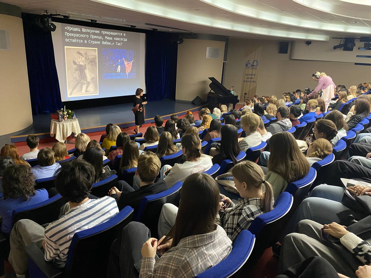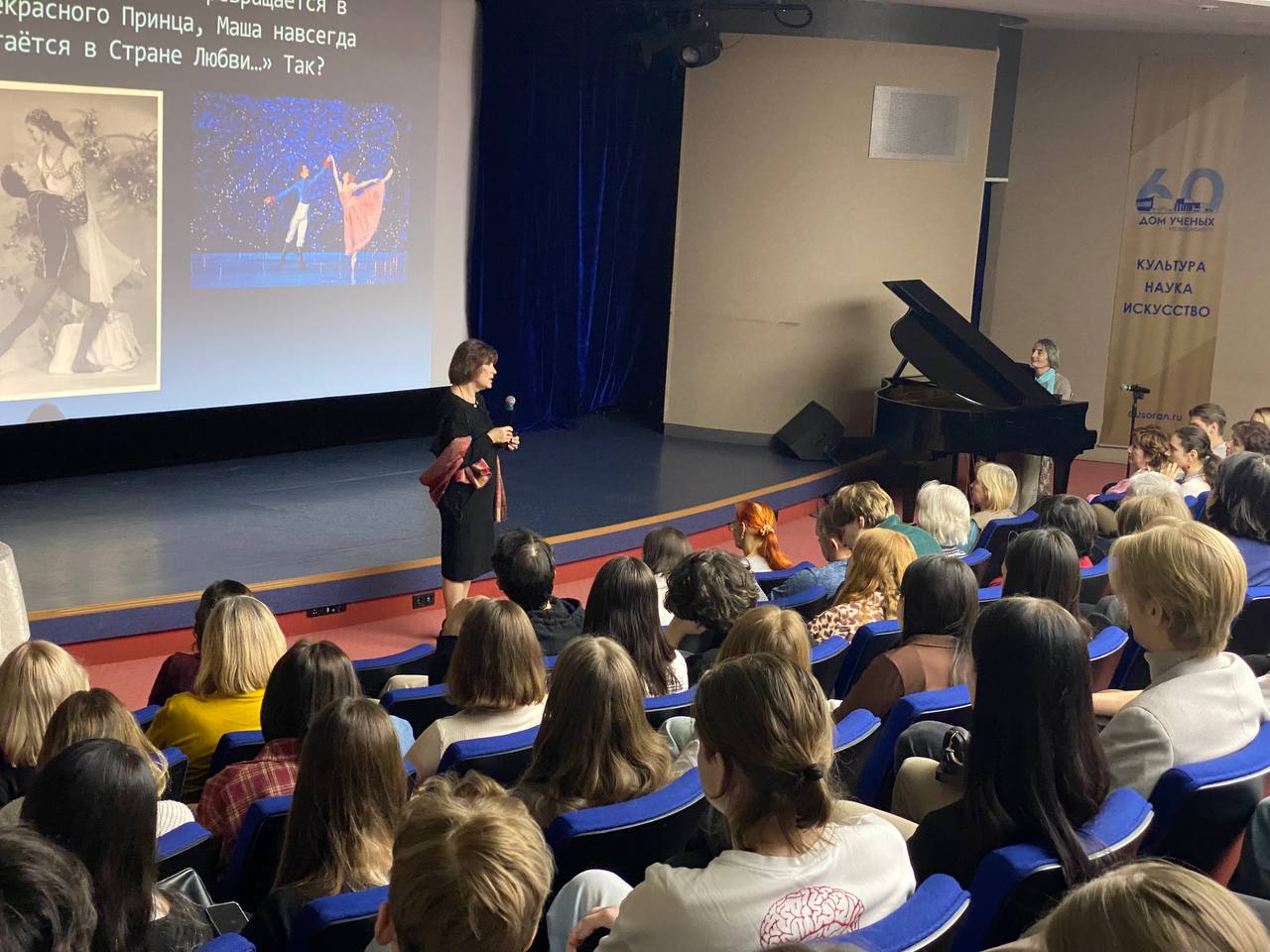 Свой рассказ Наталья Юрьевна иллюстрировала отрывками фильмов - балетов "Щелкунчик". а в завершении лекции слово взяла Мария Александровна Тимофеева и показала истоки столь яркого успеха произведения П.И.Чайковского в его биографии, в его любимых произведениях Баха, Моцарта, Шопена.