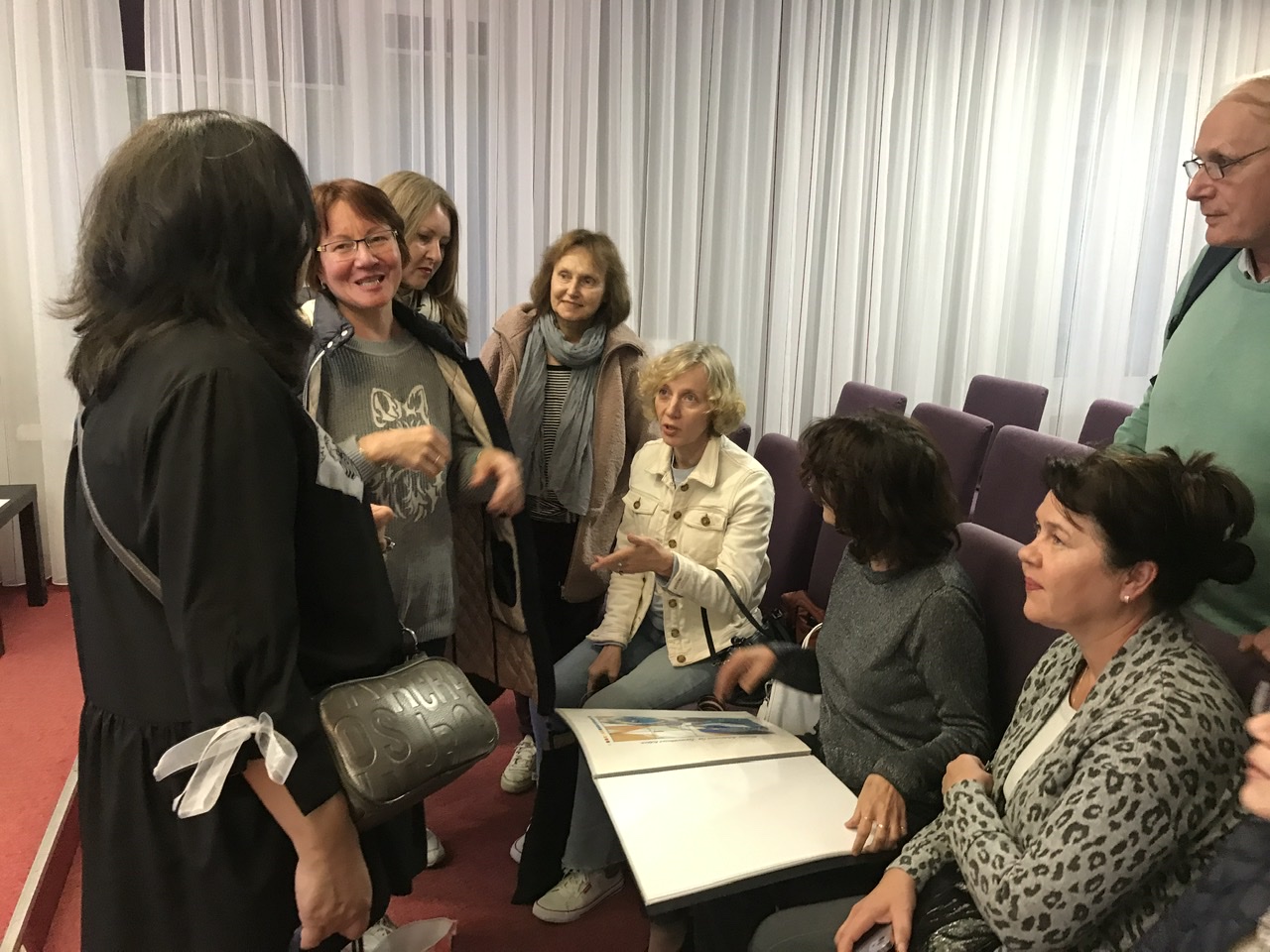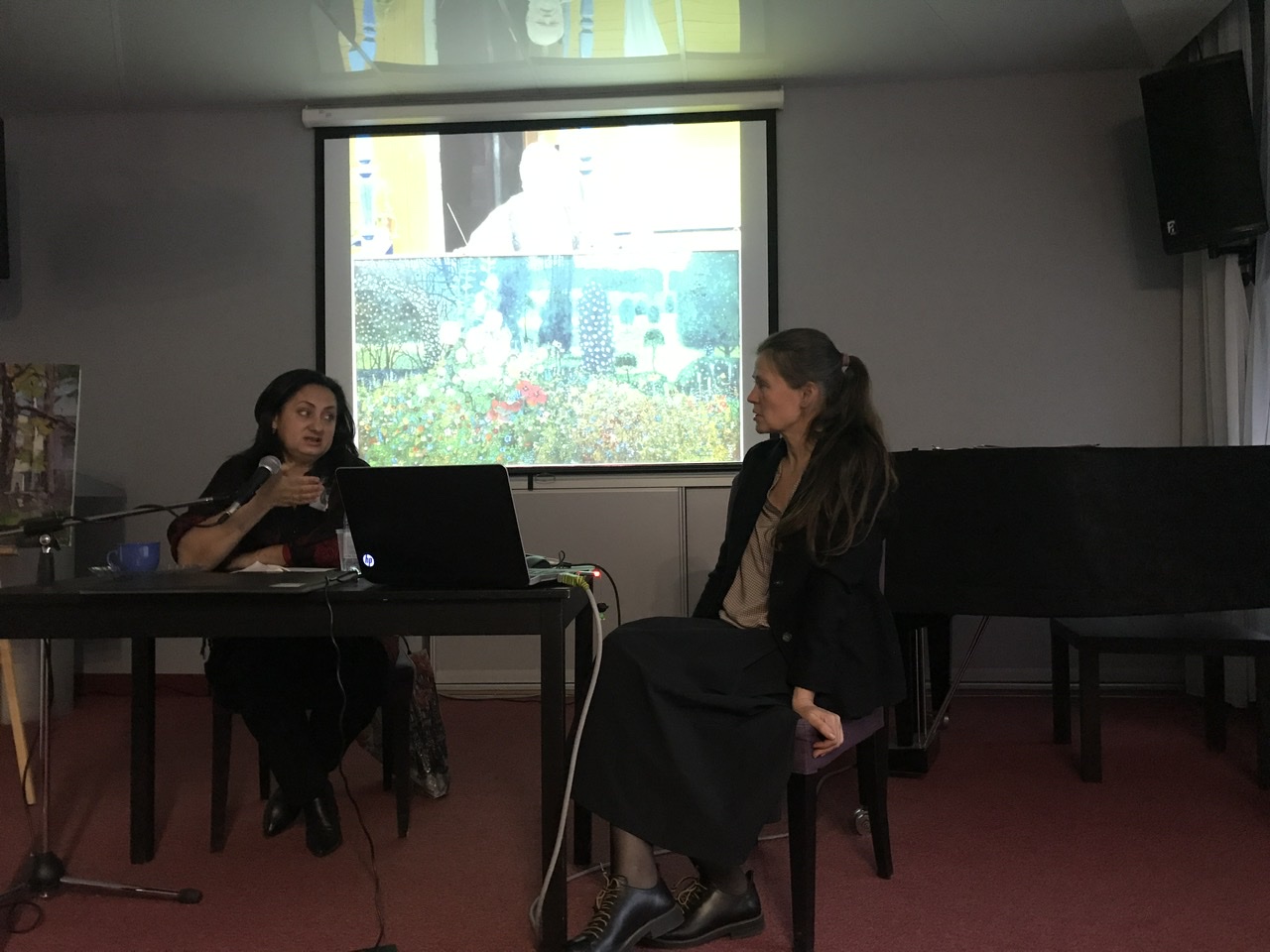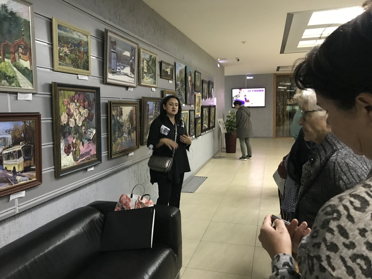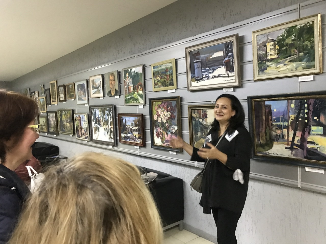 После беседы в Музыкальном салоне и ответов на вопросы все вместе ещё раз прошли на выставку "Учитель и ученики", в которой представлены пленэрные работы Оксаны Новиковой и её учеников выпускного курса монументального направления НГУАДИ. Выставка продлится только до 25 сентября.