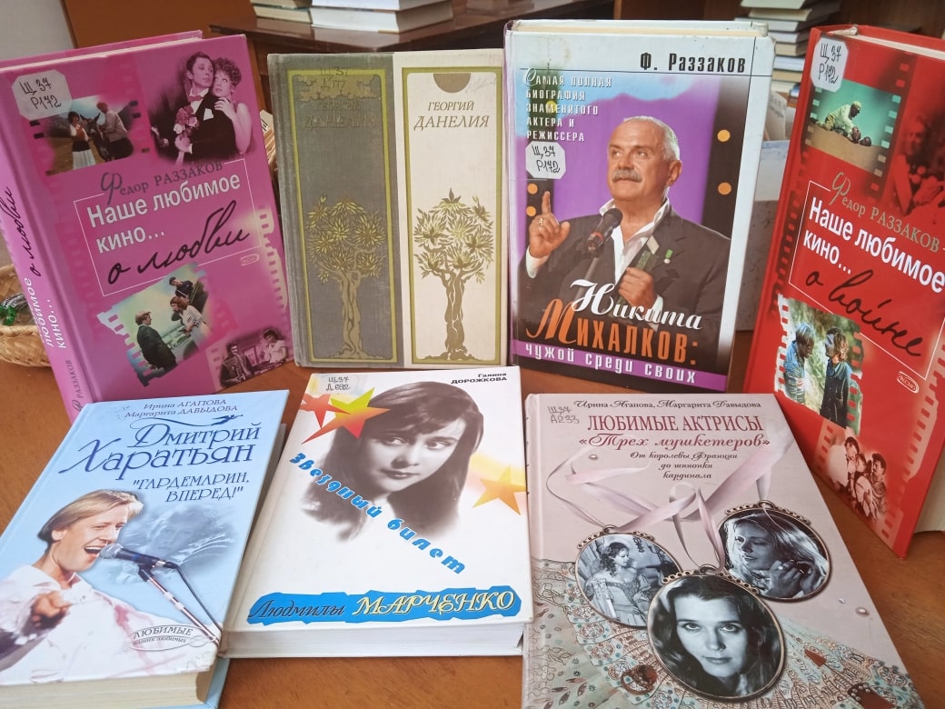 На выставке также представлены книги о российском кинематографе, отечественных режиссерах, актерах и актрисах нашего кино: Николае Еременко, Николае Караченцове, Игоре Косталевском, Андрее Ростоцком, Александре Абдулове, Георгии Данелии, Людмиле Гурченко, Ирине Алферовой, Елене Цыплаковой, Алисе Фрейндлих, Людмиле Марченко, Маргарите Тереховой и многих других.