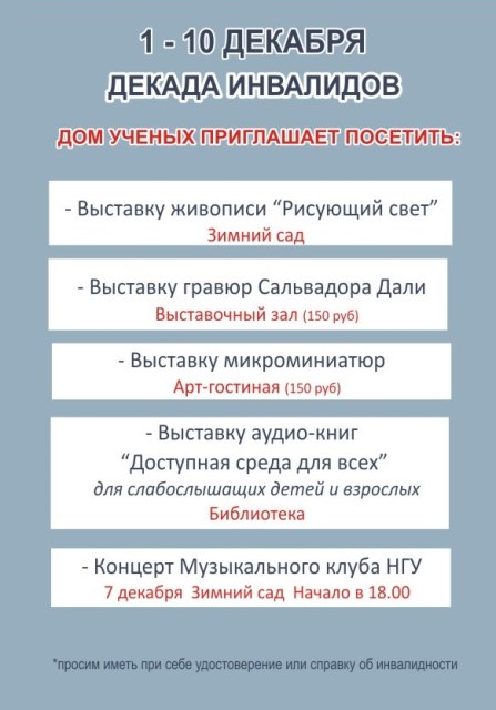 Дом ученых традиционно готовит ряд мероприятий с льготными условиями посещения для людей с ограниченными возможностями.