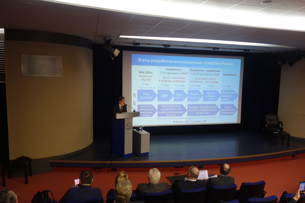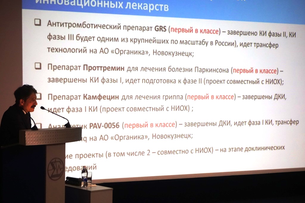 Заведующий отделом медицинской химии Новосибирского института органической химии им. Н. Н. Ворожцова СО РАН, профессор, член-корреспондент РАН Нариман Салахутдинов в своем докладе рассказал о процессе разработки новых молекул, который приводит к созданию препаратов от различных болезней. В частности о создании в Институте органической химии молекулы препарата от болезни Паркинсона и доклинических испытаниях нового лекарства.
