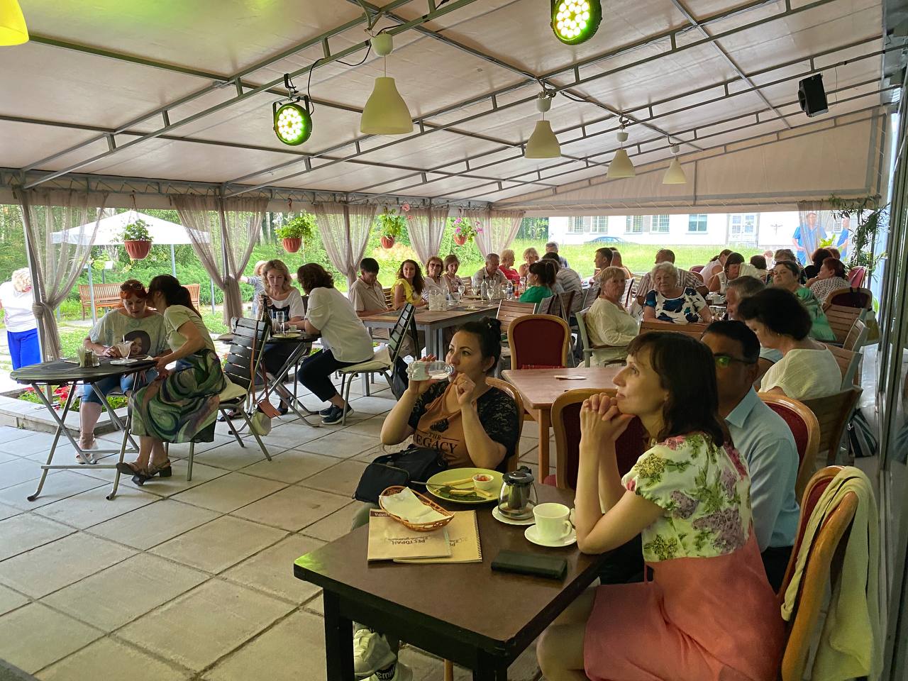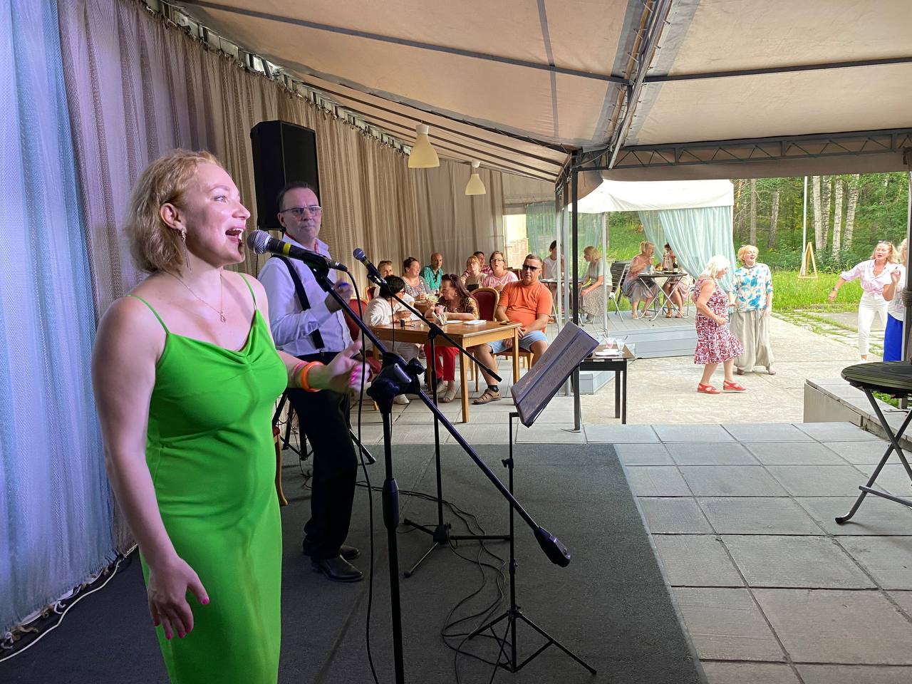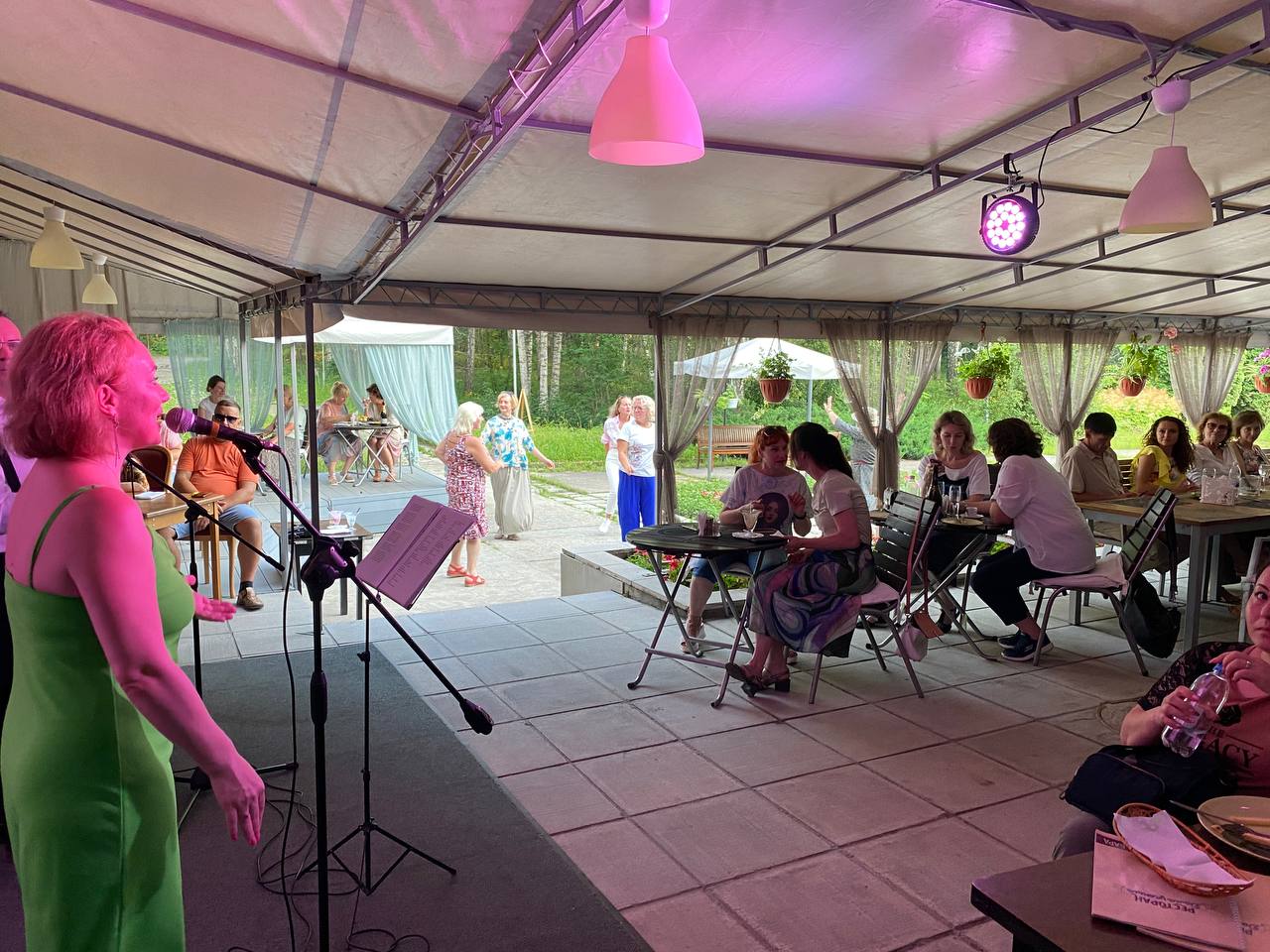 В среду вечером в летнем дворике вновь звучали любимые мелодии в исполнении Ольги Пугачевой и Аркадия Лунева. 12 июля прошла их концертная программа авторских и популярных песен о любви. Этот дуэт уже хорошо знаком нашим гостям, поэтому свободных мест практически не было, зато было очень хорошее настроение. Многие танцевали, и даже июльская жара не испугала ценителей таланта любимых исполнителей.