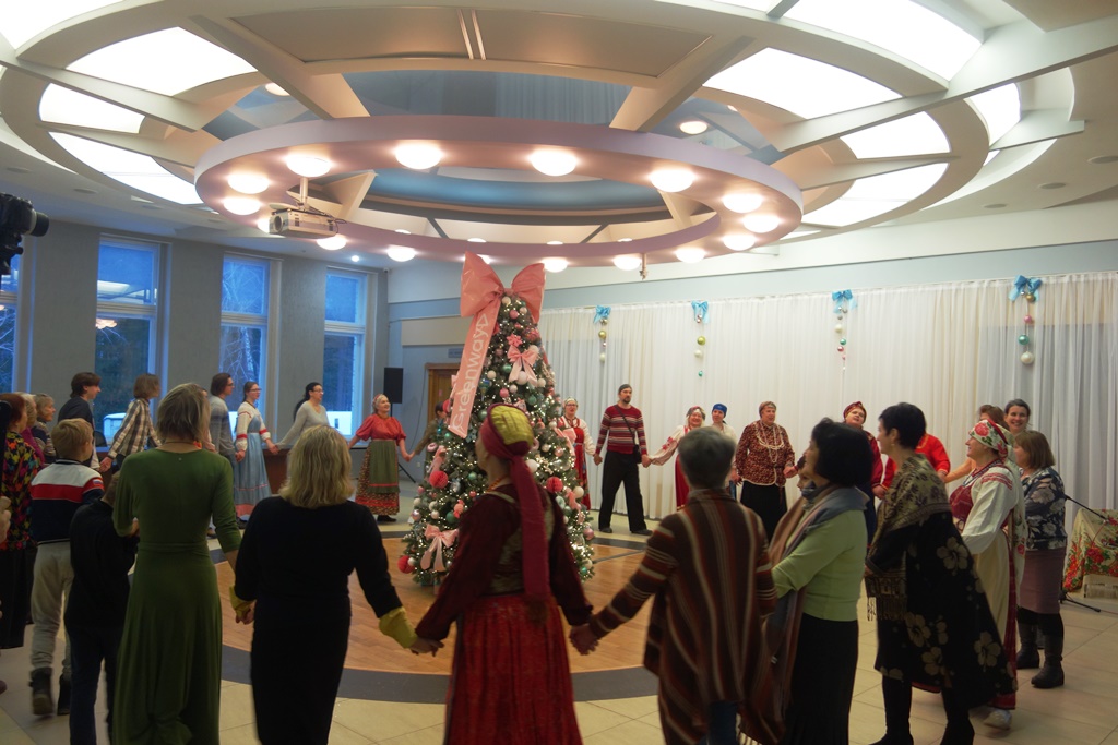 По завершении концерта в Зимнем саду началась Праздничная вечерка в фойе Малого зала, которую провели участники клуба народной песни под руководством Натальи Оболенской.
