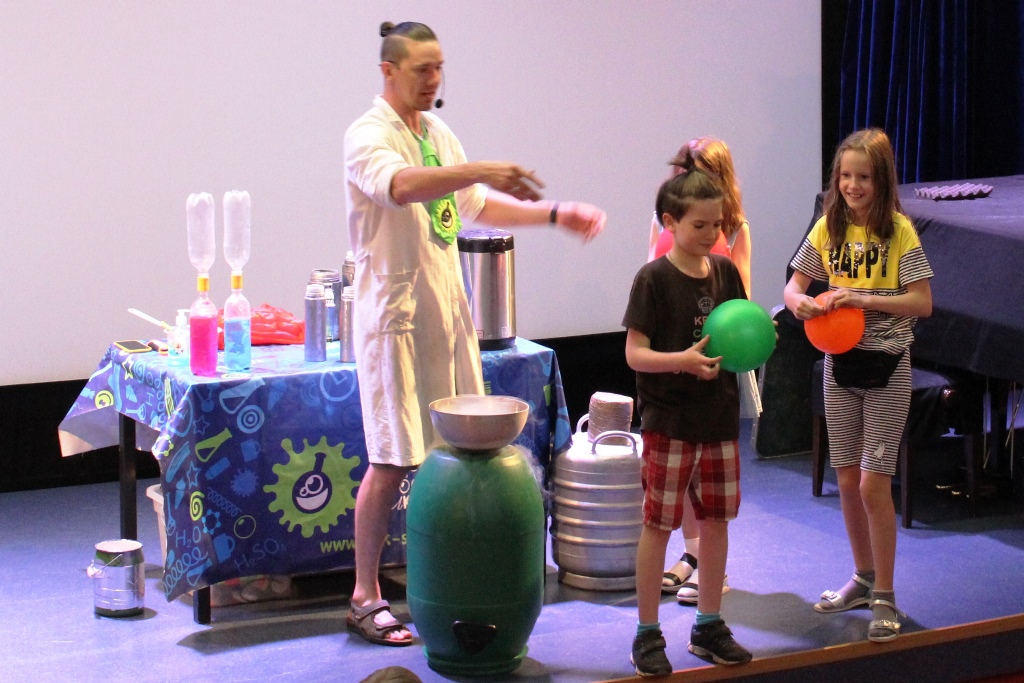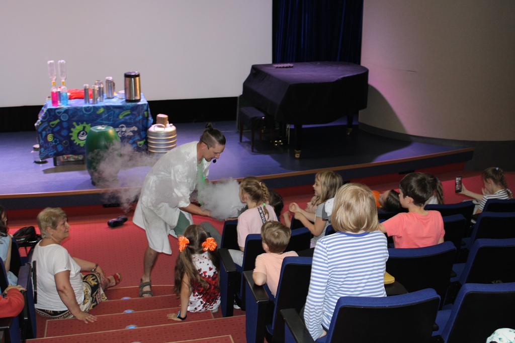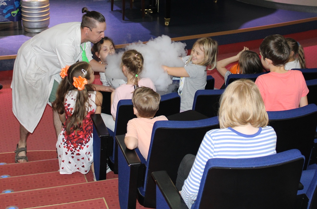 Мы заглянули в клуб на минутку, просто из любопытства, а попали сразу аж на два мероприятия: «Научное шоу профессора Николя» и День именинника. «Профессор» провел с ребятами серию познавательных супер-экспериментов с жидким азотом, а повара ресторана Дома ученых приготовили на праздничное чаепитие большой именинный пирог и три вкуснейших тортика в подарок именинникам.