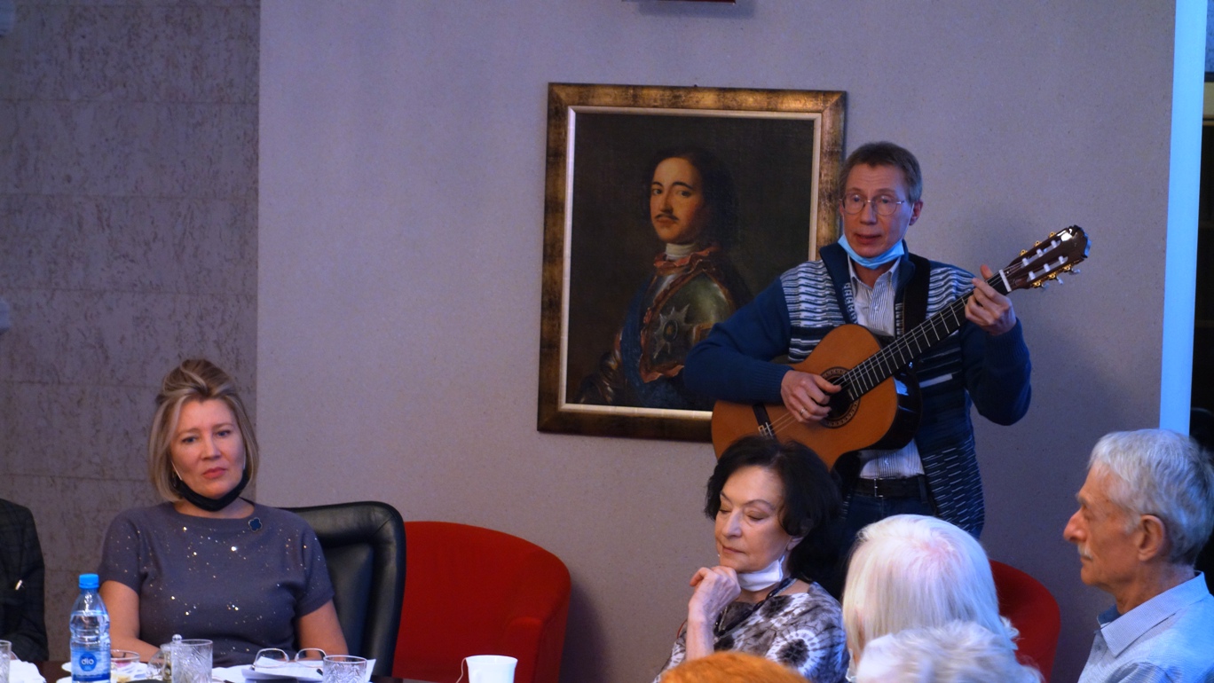 Несколько песен под гитару исполнили представители клуба авторской песни - Ольга Васильева и Алексей Глазырин при участии председателя клуба "Родник" Дмитрия Грайфера. "Слушая ваши песни, я вспоминаю бардовский фестиваль 1968 года, когда я учился на 2-м курсе НГУ....", - сказал академик Сергей Алексеенко - председатель Совета Дома ученых.
