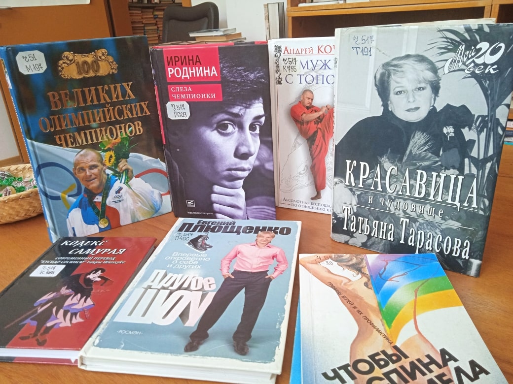 Наш XXI век – век значительных социальных, технических и физических преобразований. Сегодня модно и престижно заниматься спортом, вести здоровый образ жизни. О союзе здоровья и физической культуры людям известно с незапамятных времен. В фондах нашей библиотеки имеется огромное количество книг по спортивной тематике. Большую часть выставки занимают книги, посвященные великим людям – легендам российского спорта. Спортивная жизнь России – одна из самых успешных в мире по числу выдающихся спортсменов и тренеров, по количеству и качеству завоеванных наград, по уровню организации соревнований, по активности болельщиков на международных и национальных турнирах; она наполнена уникальными традициями и яркими достижениями. Авторами многих книг являются спортсмены или тренеры. «Вся моя жизнь состоит из жизни моих учеников. Через них я разговаривала с миром. И миллионы людей меня “слушали”» – пишет в книге «Красавица и чудовище» знаменитый тренер Татьяна Тарасова. Ирина Роднина книгу о своей судьбе фигуристки неслучайно назвала «Слеза чемпионки». Эту слезу, скатившуюся по щеке юной спортсменки, помнят практически все. Телевизионная картинка, на которой Роднина и Зайцев стоят на высшей ступени олимпийского пьедестала в Лейк-Плэсиде, обошла весь мир и стала символом советских спортивных побед. Но что творилось в эти минуты в душе чемпионки, она расскажет сама.
