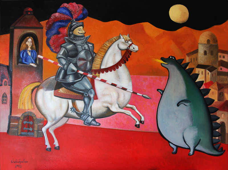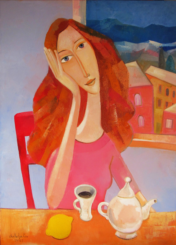 Любимые темы и образы Олега Шелудякова – ангелы и городские виды, портреты задумчивых красавиц и пустынные приморские пейзажи, забавные животные и жанровые сцены – существуют словно в двух проекциях: хронологически-линейном, историческом времени и там, где время становится своим антиподом, т.е. Вечностью.