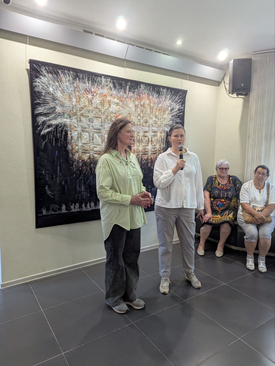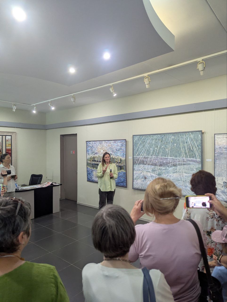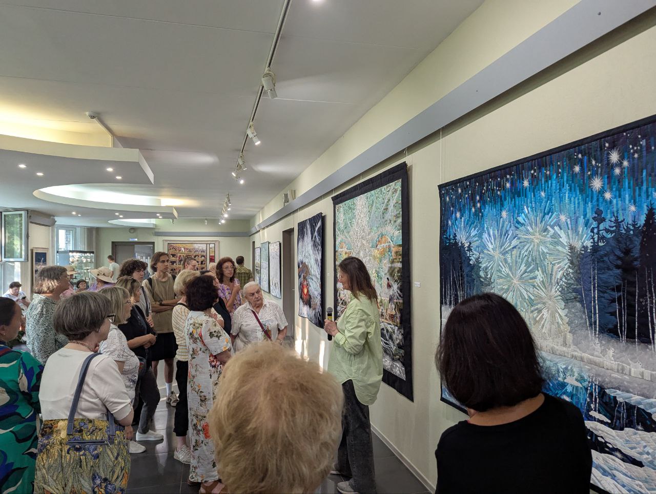 Художник из Санкт-Петербурга Бэлла Байкова представила в Доме ученых свои произведения в технике инновационного квилтинга на выставке СВЕТ ШЕЛКА. В экспозиции - 10 панно разных лет из натуральных тканей, собранных в сложнейшие коллажи. Кроме очень известных и любимых зрителями произведений, которые можно увидеть в одноименном альбоме автора - "Театр", "Крещение", "Мистерия Рождества", зрителям было продемонстрировано и самое свежее творение, которое было создано по заказу и будет украшать частный интерьер. Множество поклонников искусства Бэллы Байковой терпеливо ждали открытия экспозиции вечером 3 июля. Выставка собиралась буквально "с колёс" из-за задержки самолёта. Интерес у мастеров лоскутного шитья Новосибирска, как и у наших гостей из других регионов к данной выставке очень высок. Многие решили приехать на очередной фестиваль лоскутного шитья "У моря Обского" специально чтобы увидеть наших хэдлайнеров - Бэллу Байкову, Ксению Дмитриеву и их коллекции.