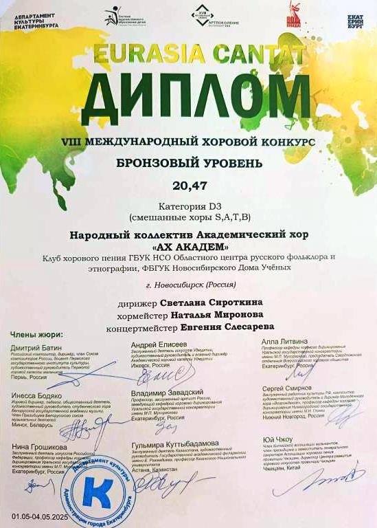 Коллективы Новосибирского Дома ученых и Областного центра русского фольклора и этнографии вокальный ансамбль «Адамант» и академический хор «АХ Академ» приняли участие в VIII Международных хоровых ассамблеях Eurasia Сantat, проходивших 1-4 мая 2025 г. в Екатеринбурге.