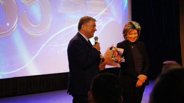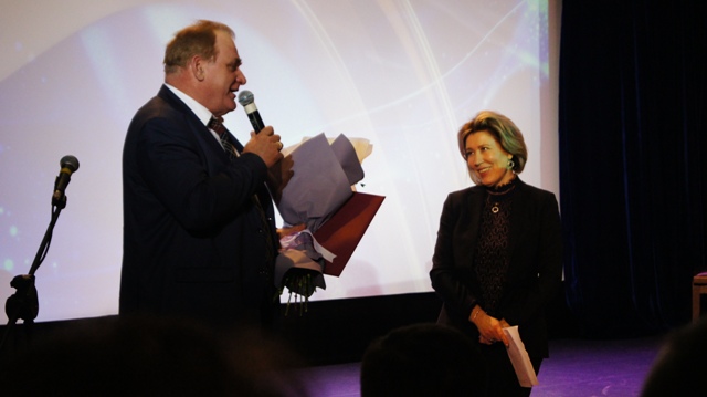Директор Дома ученых Г. Г.Лозовая принимает поздравления от руководителя Сибирского территориального управления Минобрнауки А. А. Коловича