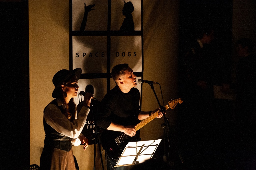 В спектакле много живой музыки и английских песен в исполнении рок-группы Space Dogs.