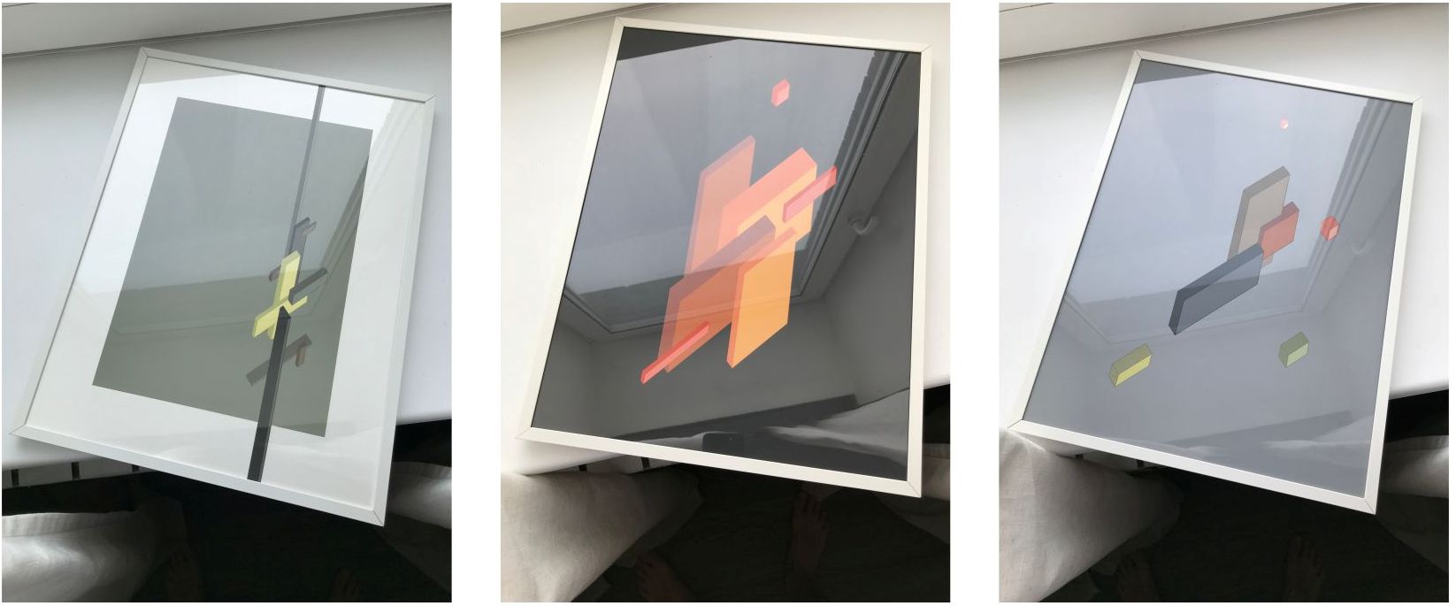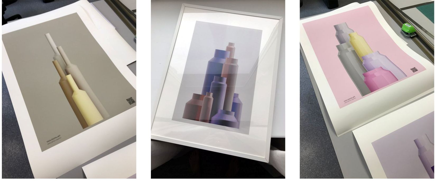 В процессе создания набросков к проектам и свободного эскизирования появились две серии работ: VAZA.digitalart и Axonometric.Geometric. Оптически серии не связаны, но визуально они перекликаются и объединены общей концепцией-построение пропорциональных цветовых композиций из геометрических фигур. В серии VAZA.digitalart композиции составлены из условных ваз, а именно из цилиндров различного размера и материала-цвета, работы из серии Axonometric. Geometric в основном составлены из цветных квадратов и прямоугольников.
