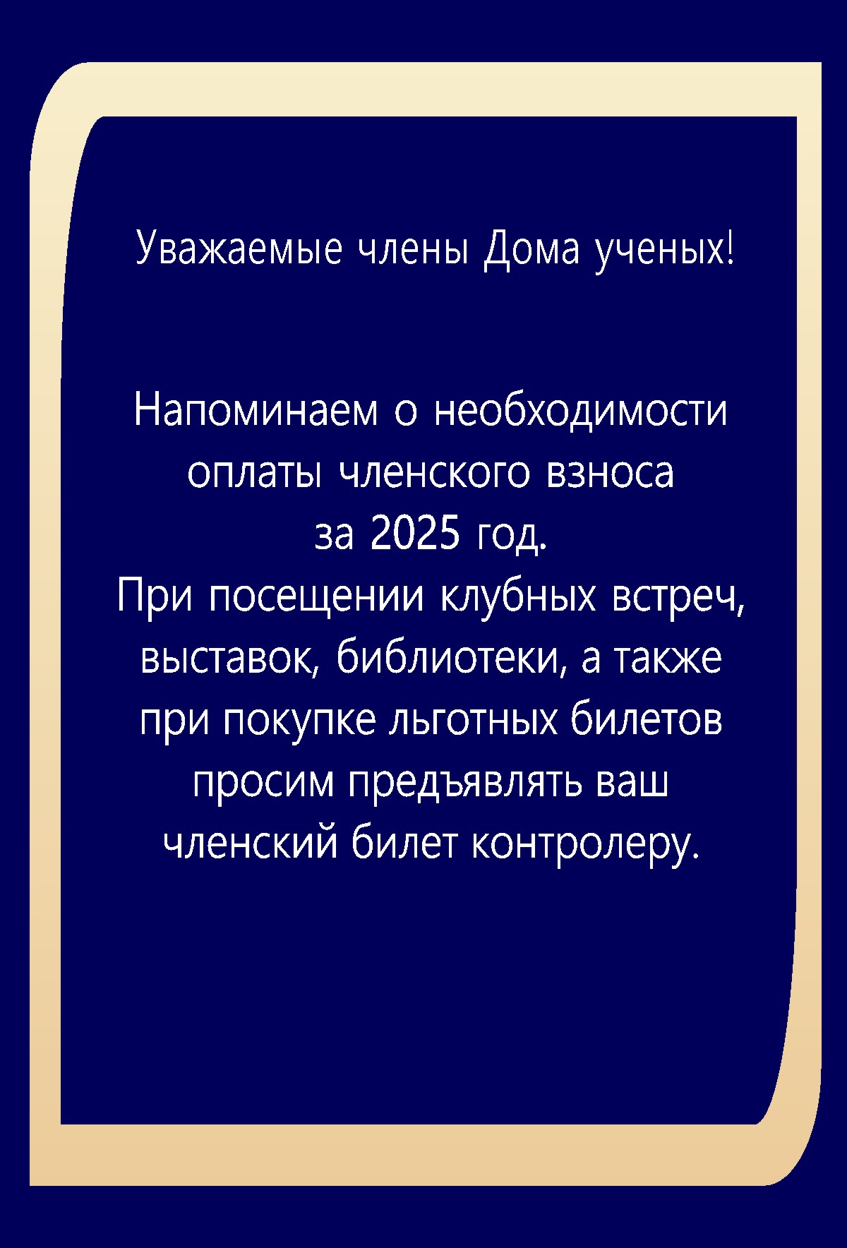 Членские взносы (1800 руб в год) принимаются с 10.00 до 20.00 ежедневно в кассе Дома ученых (вход со стороны ресторана, первый этаж) и в комнате №105 с 9.00 до 17.00 в рабочие дни.