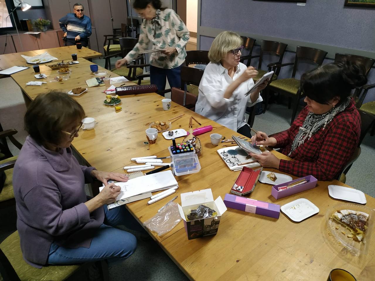 После вернисажа гостей принимал Арт-клуб Дома ученых. Студийцы - частые гости на клубе и на "Беседах об искусстве". Как всегда, было интересно и весело. Гости с удовольствием попозировали и получили в подарок свои портреты. Вспоминали прошедшее лето, самые интересные моменты пленэров и яркие выставочные проекты: Лиры Цукановой, крымских художников и т.д.
