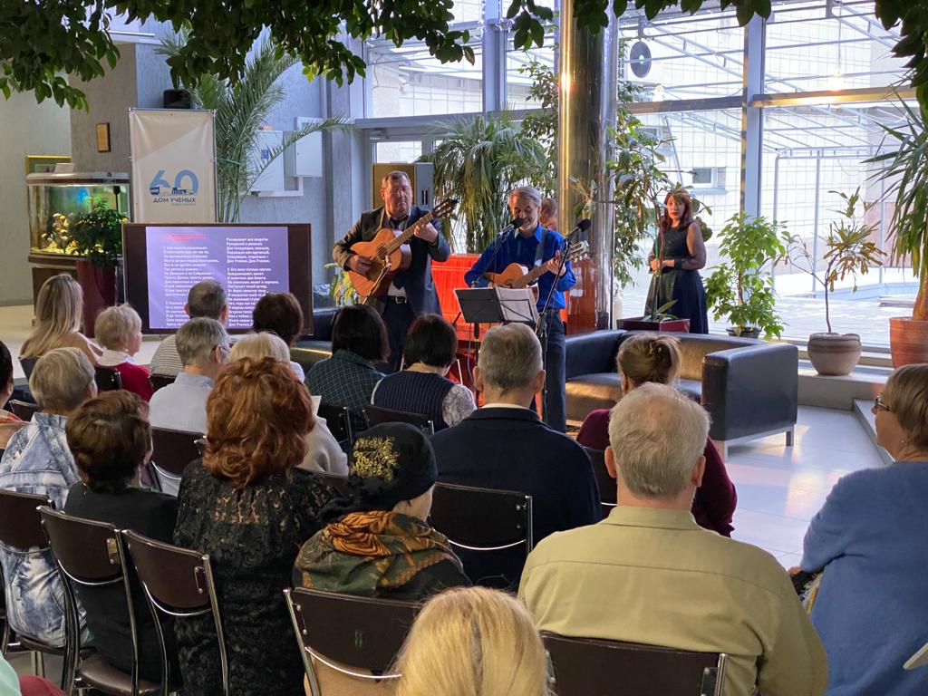 В Зимнем саду под легендарным фикусом несколько десятков слушателей наслаждаются бардовской программой «Пою тебе, мой Дом ученых». Владимир и Наталья Аникеевы и Сергей Рахчевский исполняют авторские песни, посвященные Дому ученых. Здесь и вариация на тему «Александры» из фильма «Москва слезам не верит», и специально сочиненные и положенные на музыку композиции.