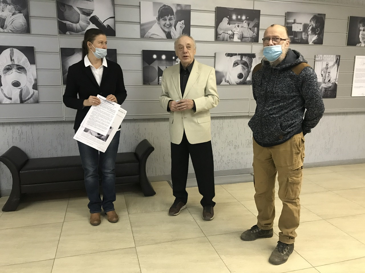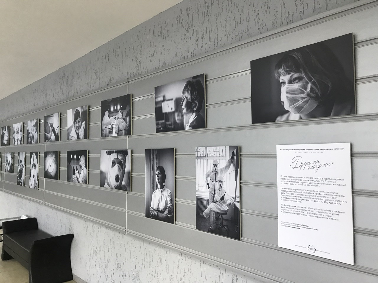 Автором фотопроекта стал иркутский фотограф Евгений Козырев, мастер индустриальной и аэрофотосъемки, для которого возможность сделать эту работу стала началом целой серии съемок на эту актуальную тему. В итоге прошло несколько фотовыставок в родном Иркутске и теперь его работы, рассказывающие о самых разных сторонах жизни медицинского центра, ставшего ковидным госпиталем, разных его отделений и служб, можно увидеть в Доме ученых в новосибирском Академгородке. На открытии присутствовали руководители новосибирского отделения Союза фотохудожников России Е.Л.Иванов и А.И.Лашков, которые отметили хорошее качество фотографий, актуальность такой работы и современную подачу зрителям. Все фотографии напечатаны на широкоформатной технике и наклеены на пенокартон, что делает очень удобных их просмотр, без бликов от стекол.