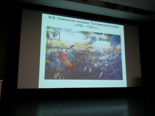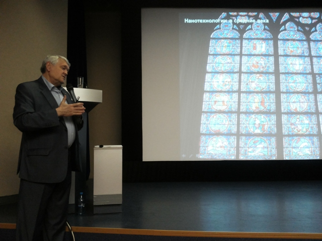 В лекции «Нанотехнологии в науке и вокруг нас» академик показал исторический аспект данного направления, проиллюстрировав его слайдами средневековой мозаики в одном из западноевропейских соборов и мозаичной картиной работы великого русского ученого М. В. Ломоносова.