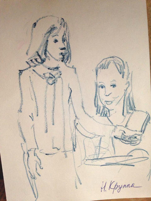 В этот день рисовали везде! Наших библиотекарей зарисовал участник пленэра "По следам Николая Шагаева" Наталья Круппа.