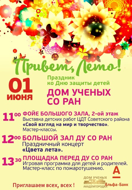 В Международный день защиты детей Дом ученых предоставляет свою большую сцену лучшим художественным коллективам Советского района. Так и на этот раз: По сценарию «Привет, лето!» культурно-массовый отдел Дома ученых совместно с Центром детского творчества подготовил концерт, в котором приняли участие около полутора десятков танцевальных и вокальных коллективов. Здесь были яркие, красивые номера от детских садов и от подростковых вокальных студий, классический и народный танцы, современные композиции в стиле «техно», был также эстрадный вокал и декламация. Родители, бабушки и дедушки, присутствовавшие в зале, с восхищением встречали каждое выступление, отмечая, как много у нас в районе художественно одаренных детей и не менее талантливых педагогов, чьими стараниями раскрываются детские таланты.