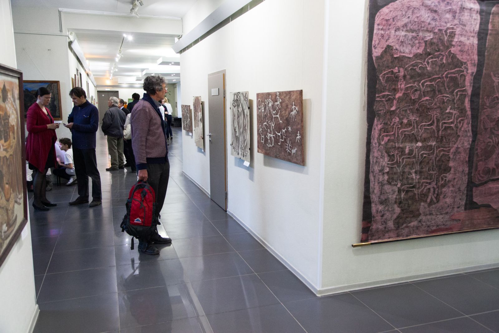 Это не первая выставка Владимира Капелько в залах Дома ученых, но на первой выставке было представлено только древнее искусство Хакасии, наскальные изображения, которые Владимир Капелько изучал целых 25 лет ион же изобрел метод копирования произведений древних художников на микалентную бумагу. На новой выставке представлены и работы самого Капелько - пейзажи, портреты, жанровые сцены, композиции по мотивам древнего искусства и даже берестяныеподелки автора - короба, букарашницы, детские ирушки, фляжка, нож.