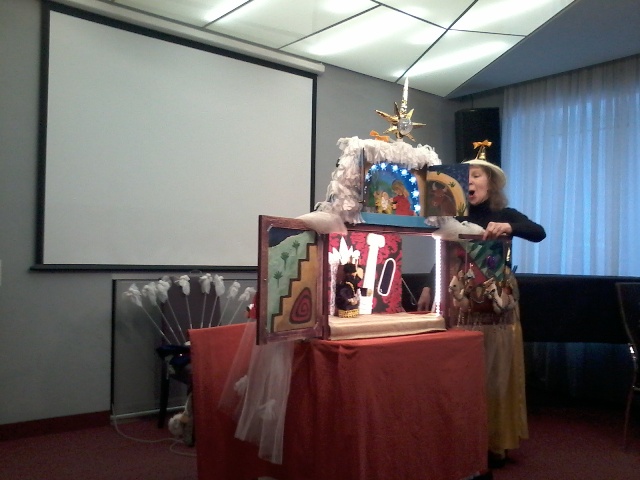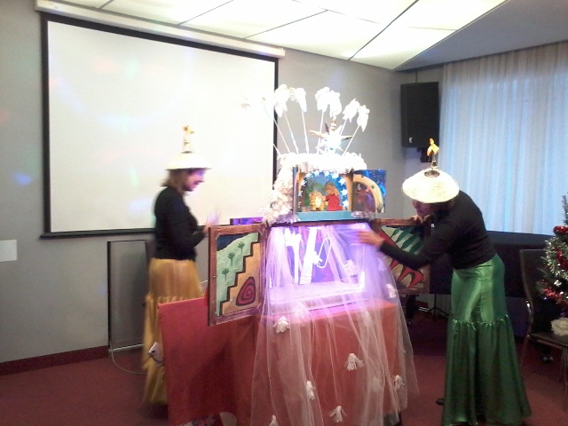 Очень интересный спектакль для детей и взрослых представил 23 декабря кукольный театр «Миссис Хадсон». Это была традиционная история о рождении Иисуса Христа, о поклонении волхвов, о жестоком царе Ироде. Но были там и народные персонажи – веселый Скороход, шуточный Генерал. В конце загорается яркая Рождественская звезда. Весь спектакль сопровождает прекрасная музыка: это и колядки, и отрывки из музыки Грига к «Перу Гюнту», и «Болеро» Равеля – все это создает волшебное настроение. Постановка воспроизвела народное ярмарочное представление, поэтому она была интересна всем возрастам. После спектакля всем дали поиграть с чудесными куклами, которых молодые женщины Наталья Ершова и Валентина Волова сделали своими руками. Они же и исполняли все роли.