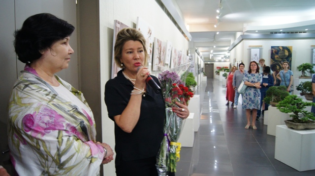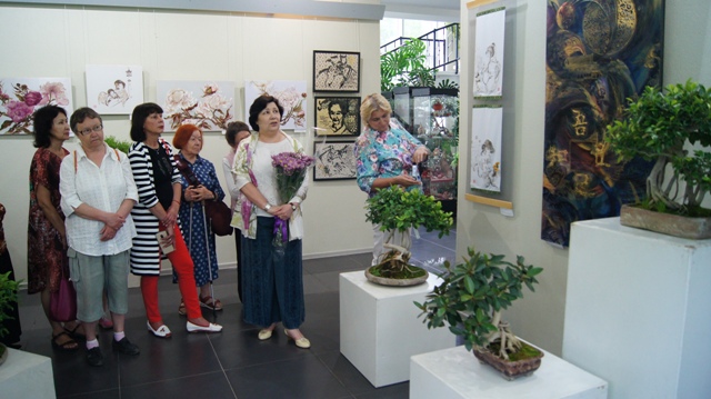 Гармония, летняя свежесть, красота - так можно описать ощущения зрителя, попавшего в этот удивительный мир, выставку авторских графических работ и картин на шёлке и миниатюрных лиственниц, миртов, фикусов и лавров. Здесь необычайно всё: от приёмов японской работы кистью - до ароматов и мягкости случайных прикосновений. Гости вернисажа не спешили уходить, ведь такие мгновения радости и живого общения запоминаются очень надолго и наполняют, одухотворяют нашу жизнь.