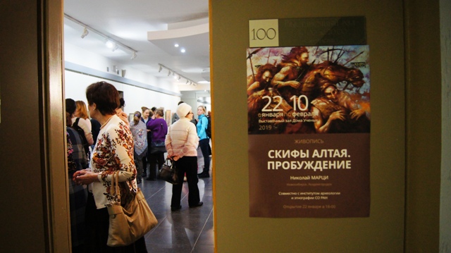 Воображаемый мир далёкой эпохи жизни скифов на алтайской земле в картинах Николая Марци увидели гости вернисажа его выставки живописных работ "Скифы Алтая. Пробуждение", который прошёл 22 января в выставочном зале Дома ученых.