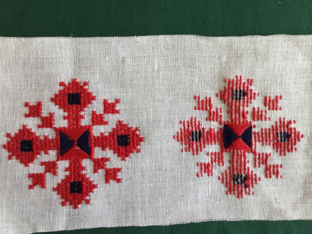 Автор статьи выполнила фрагмент узора столешницы техникой двухстороннего шва и техникой крестик. На следующем снимке приводится фото этого фрагмента с изнаночной стороны. Как видим, изнанка, вышитая пришедшим к нам в 19 веке крестиком выглядит совсем не так же, каклицевая сторона. «Сухие натуралистические образцы, далекие от народного искусства, сыграли отрицательную роль в развитии русской, а также украинской вышивки» и мы забыли наш древнейший шов, и стало возможным говорить: « … и заимствованная техника становится неотъемлемой частью русской традиционной культуры».
